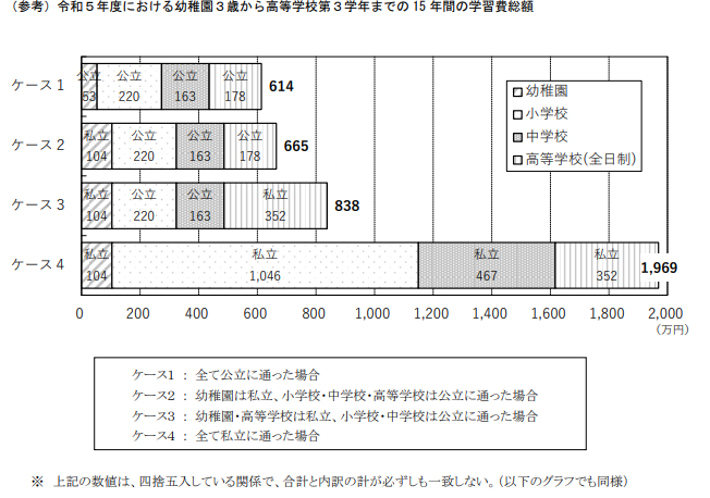 まず見てほしいのが、文部科学省の「子供の学習費調査(令和5年度)」よ。この調査では、幼稚園から高校まで15年間の学習費を、進路別に単純合計したケースが示されています。