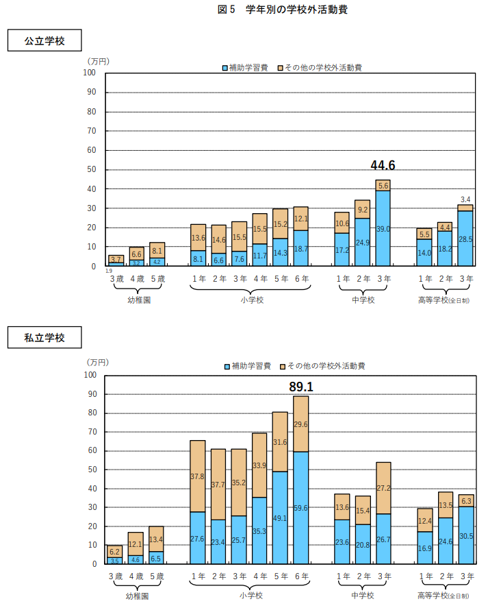 このグラフでは、公立・私立それぞれについて、学年ごとの学校外活動費(塾・習い事・補助学習など)が示されています。