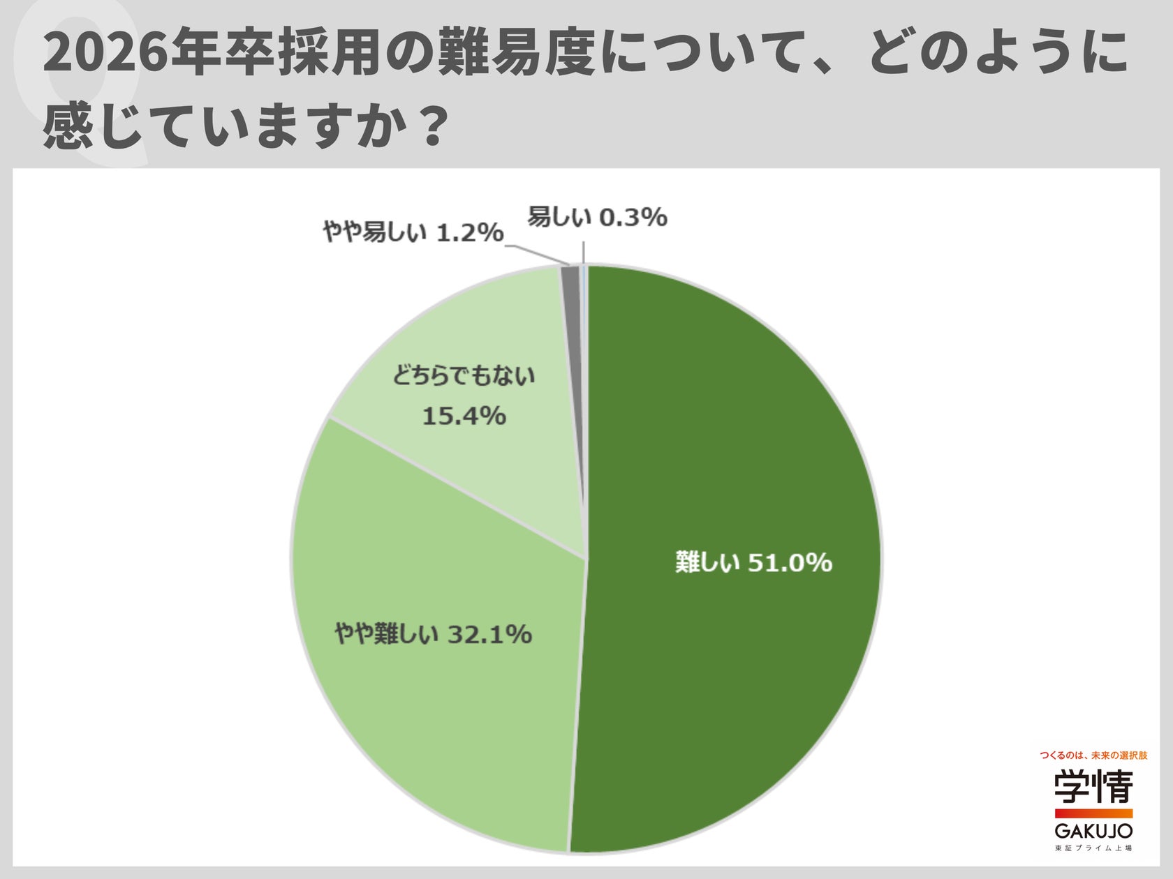 株式会社学情のプレスリリース(2025年7月14日 10時00分)2026年卒採用の「難易度が高い」と感じている企業が8割超。「売り手市場で母集団の質量低下」「早期化と長期化、二極化進み読みづらく」