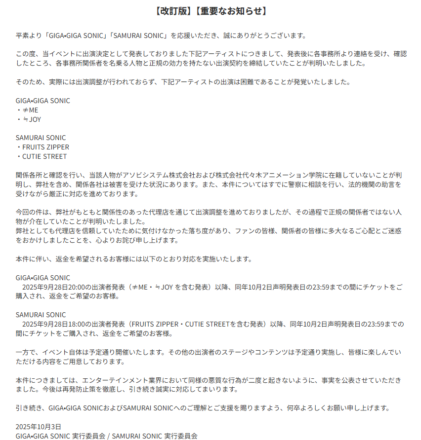 - 2025年10月の音楽フェスで、偽の事務所関係者が契約を結び4組の出演が中止