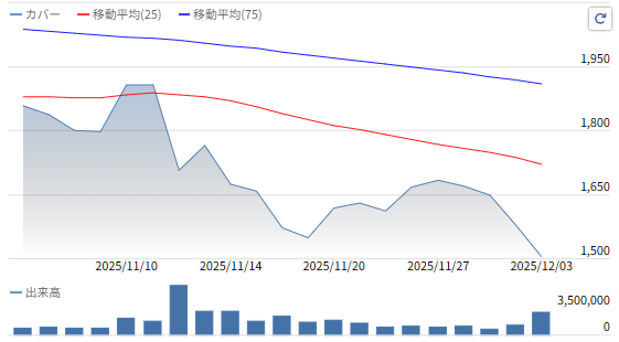 カバーは、天音かなたさんの卒業発表直後に株価が年初来安値を更新し、4日続落したと報じられています。 人気VTuberの卒業発表を「ネガティブ視した売り」が出ているとされており、タレント離脱が業績や事業継続性への懸念として意識されたことが読み取れます。