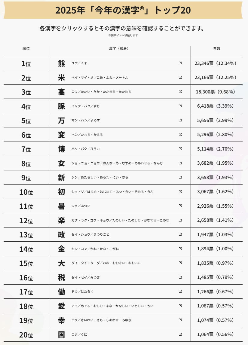 全国各地で熊の目撃・被害が相次ぎ、社会全体が人と自然の距離感を再考する一年でした。清水寺での発表(12月12日、日本漢字能力検定協会)によれば、全国から寄せられた約18万9千票のうち、「熊」が2万3,000票以上を集めて1位に。2位は「米」(アメリカやコメ価格上昇などを象徴)、3位は「高」(物価や気温の「高」を反映)でした。