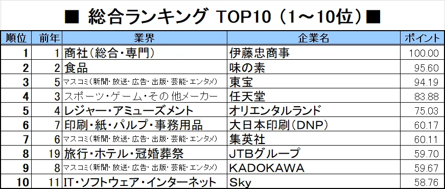 - 伊藤忠商事が8年連続1位となり、生活に近い事業と働き方改革が評価された