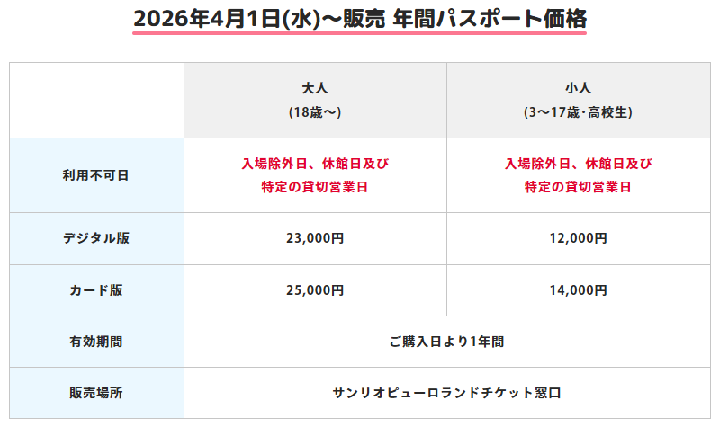 - サンリオピューロランドは、2026年4月から年間パスポートの価格と条件を改定