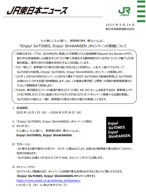 今回のSixTONESとのコラボも、鉄道利用の楽しさを伝え、より多くの人に新幹線を利用してもらうことが狙いでした。