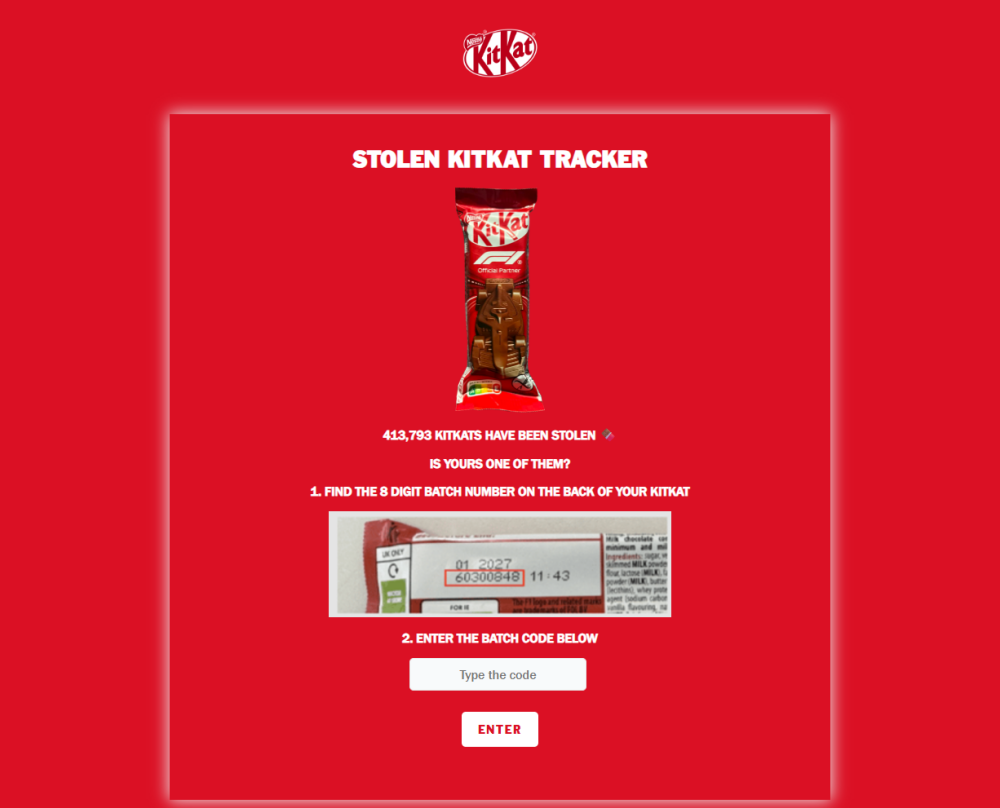 ここで注目したいのは、ネスレが単に「盗まれた」と発表しただけではなかったことです。報道によれば、商品に印字された8桁のバッチコードを入力して、盗難ロットかどうかを確認できる「Stolen KitKat Tracker」が公開されました。一致した場合は、写真や購入場所などの情報提供につながる案内が表示される仕組みです。