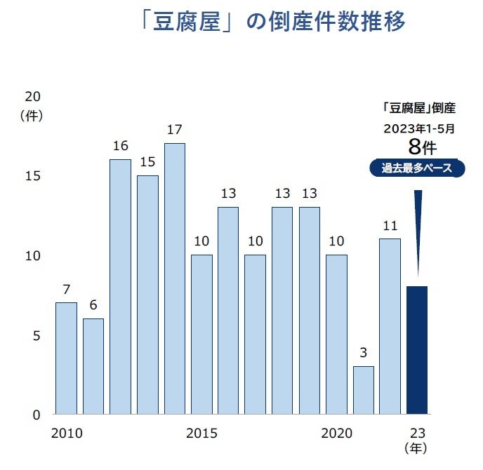 ですが、最近とうふ屋さんの倒産(会社がつぶれること)が増えているのです。1月から5月で8件。これは今までで最悪のペースです。
