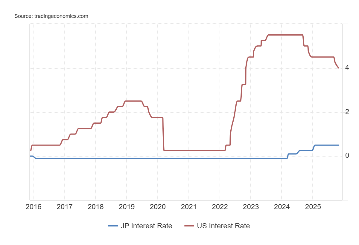 欧米では、パンデミック後の急回復によってインフレが急上昇し、2021年以降FRBや欧州中央銀行が大幅な利上げを実施しました。その後、物価上昇が落ち着き始めたため、2024年末から2025年にかけて利上げを停止し、利下げに転じています