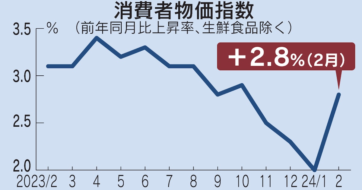 2月消費者物価指数2.8%上昇 伸び拡大、電気代抑制薄まる - 日本経済新聞